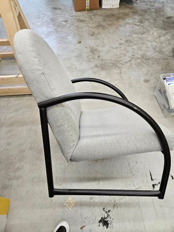 Grijze fauteuil en grijze hocker bekleed met dezelfde stof. Afmetingen fauteuil: diepte zitting: 510mm breedte zitting: 580mm hoogte rugleuning: 650mm hoogte zitvlak vanaf vloer: 400mm breedte fauteui