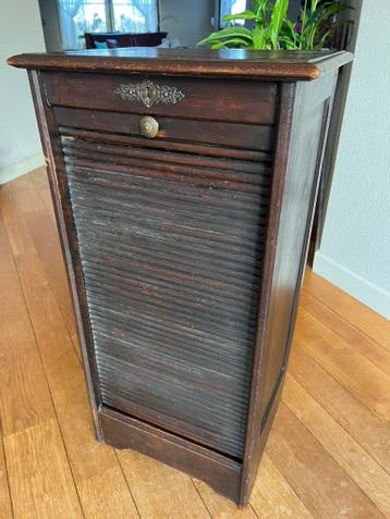 Leuk, oud bijzetkastje. Heeft wat liefde en aandacht nodig. Het rolgedeelte zit los (kan vastgemaakt worden met band), de plankjes zitten niet meer allemaal vast en het kastje kan een likje boenwas ge