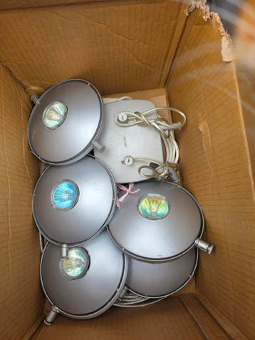 Ufo spots met halogeen verlichting. De kabel is 5 meter lang en de stroomkabel 3 meter. Er zit ook een dimbare transformator bij. De spots kun je in verschillende richtingen laten schijnen