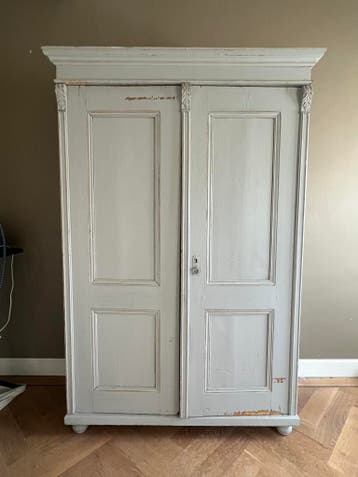 Gratis ophalen alleen di 14.4/Woe15.4/Donderdag 16.4! Deze brocante kast is licht grijs/blauw van kleur. De kast heeft twee deuren en binnenin drie planken. De afmetingen zijn 114 cm breed, 181,5 cm h