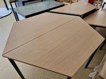 Wij hebben 4 hele dus 8 halve zeshoekstafels op volwassen hoogte over. Gratis af te halen in soest. Wie kunnen we hier nog blij mee maken?