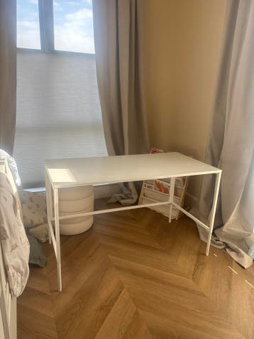 Super leuk wit stalen kinderbureau met een bijpassende bureaustoel. Het bureau heeft hier en daar wat gebruikerssporen, maar niet storend