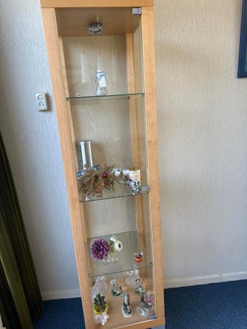 Mooie vitrinekast met glazen planken en ingebouwde verlichting. Ideaal om uw verzameling of decoratieve items in tentoon te stellen. De kast is zonder inhoud.