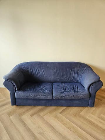 Comfortabele blauwe bank met hoge rugleuning. De bank is gebruikt en heeft een beschadiging aan de achterkant, maar zit nog lekker. Ideaal voor wie op zoek is naar een functionele en gezellige zitplek