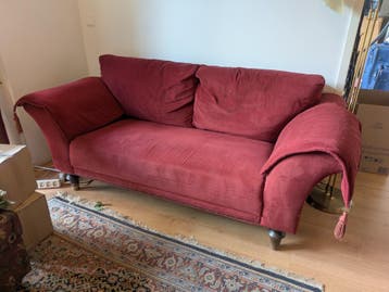 Gratis af te halen: een rode bank met gebruikssporen. De bank heeft een paar gaatjes en komt uit een huis waar gerookt is. Af te halen tot 25 april afmetingen: 94 diep 72 hoog 190 lang