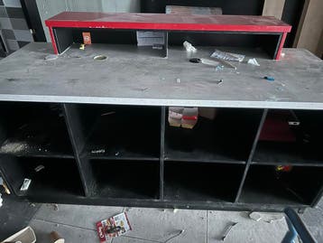 Drie toonbanken met een donkere afwerking en een licht blad. Eén toonbank heeft een rood opzetstuk. De toonbanken hebben open vakken aan de achterzijde.