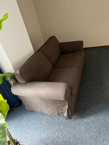 Comfortabele bruine tweepersoonsbank in gebruikte staat. Ideaal voor een kleine woonkamer of studentenkamer.