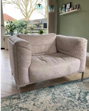 Erg fijne en ruime fauteuil met lichte beschadiging, zie foto’s. Aan de onderkant laat op 1 plek de naad iets los waardoor de vulling zichtbaar is. Bij de armleuning zit ook een klein draadje los maar