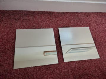 Twee vierkante spiegels 30x30cm aan de hoekjes en zijkanten hier en daar oneffenheden, zie tweede foto.