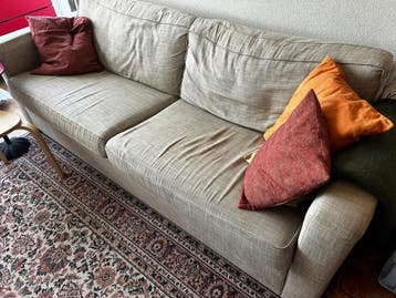 Een driezitsbank van ikea. De bank is beige van kleur. Nog meer dan goed voor een tweede ronde, zit heerlijk. Op te halen in soest as vrijdag of zaterdag (let op! Niet rijswijk) mag gratis opgehaald w