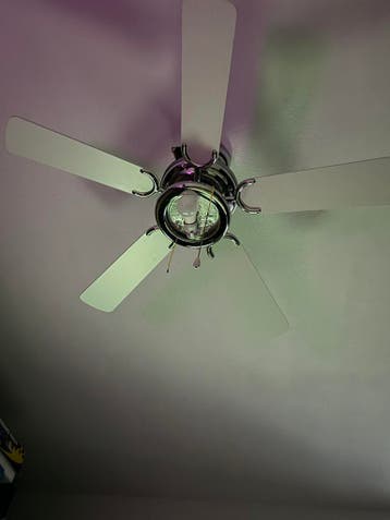 Mooie en functionele plafondventilator met vier witte bladen en een chromen behuizing. De ventilator is voorzien van een geïntegreerde lamp met een e27 fitting, ideaal voor het verlichten en verkoelen