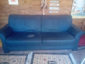 Een leren 3-zits bank. De bank heeft wat gebruikssporen op het zitvlak, zoals te zien is op de foto's. De kleur is donkerblauw. Met leervet in de kleur is hij weer netjes te maken. Het leer is onb