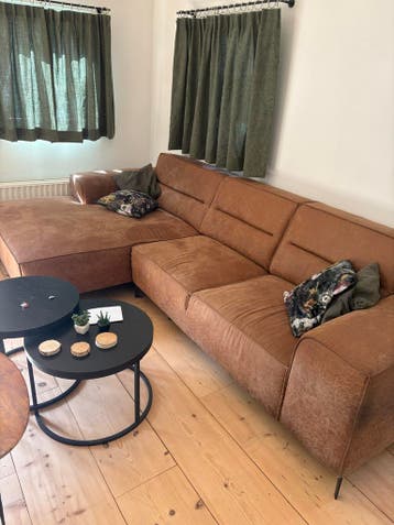 Bruine hoekbank met een chaise longue aan de linkerkant. De bank heeft een stoffen bekleding en zwarte poten. Er passen makkelijk vier mensen op. Gratis ophalen