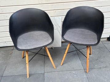 Twee zwart kunststof stoeltjes met houten poten en stoffen zitting. Netjes en onbeschadigd.