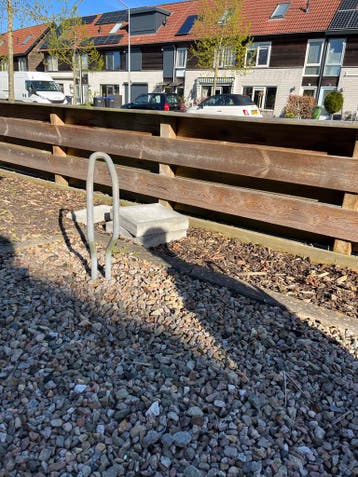 Dit zijn twee fietsenstandaarden. Ze zijn van metaal en grijs van kleur. Ze kunnen in de grond worden gezet om fietsen te parkeren. Zelf uitgraven, per direct op te halen.