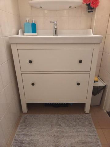 Wastafelmeubel op wasbak gemeten zijn de maten 81,5 breed 49 diep voorkant 89 hoog achter 93,5 1 pootjes en onderse lat heeft vocht schade meerdere latten zitten scheuren in.