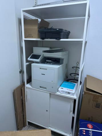 Deze witte kast heeft open planken aan de bovenkant en twee deuren aan de onderkant. De kast is al gemonteerd en kan zo worden meegenomen. Er is ook een andere kast beschikbaar.