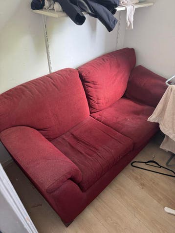 Deze rode bank is een tweezitsbank. De bank heeft twee rugkussens en twee zitkussens. Mag gratis mee. Zit best lekker