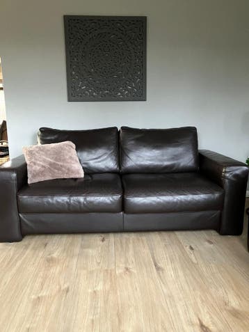 Donkerbruine 2,5 zits bank van echt leer. De bank heeft brede armleuningen en twee zitkussens. De rugkussens zijn ook van leer.