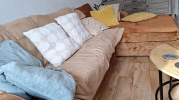 Mooie stoffen hoekbank cognaxkleur bankverkeerd in zeer goede staatsgrenzen enkelen beschadiging gratis op te halen in driebergen