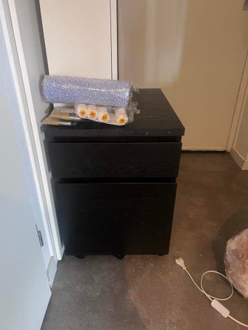 Praktisch zwart nachtkastje met twee ruime lades, ideaal voor het opbergen van boeken, opladers en andere benodigdheden naast uw bed. De bovenste la zit los maar prima te verhelpen met wat lijm.