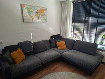 Grote hoekbank grijs van kleur. 5 Jaar oud.