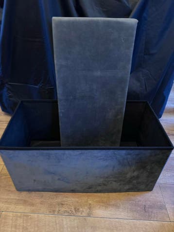Deze handige opvouwbare opbergbank/poef is perfect voor extra zitruimte en opbergruimte in elke kamer. De bank is bekleed met zacht grijs fluweel en is in goede staat. Ideaal voor het opbergen van dek