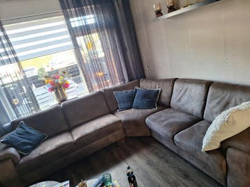 Goede hoekbank is niet doorgezakt het is een makkelijke stof wat je met een doek kunt afnemen zelf even schoonmaken er zit een brandgaatje in maar valt niet erg op