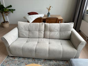 Grijze bank, wat haaltjes eraan zoals te zien is op de foto ivm slijtage. Voor de rest zit de bank echt perfect en is hij niet doorgezakt. Erg zacht. De kussens zijn wat verkleurd aan de achterkant, m
