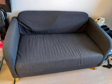 Deze 2-zits bank is gebruikt en heeft wat slijtageplekken, vooral op de zitting. De bank is blauw van kleur en heeft houten pootjes. Gratis af te halen.