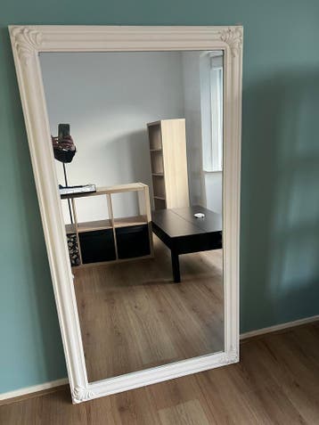 Een mooie grote spiegel met een witte, sierlijke lijst. De spiegel is rechthoekig en kan tegen een muur geplaatst worden. De lijst heeft decoratieve details in de hoeken en langs de randen. Ophalen 10