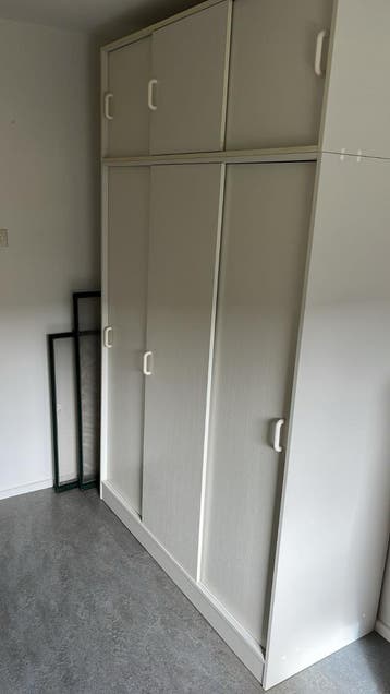 Deze kast van leen bakker is gratis op te halen. De kast heeft schuifdeuren en een hanggedeelte met een plank erboven. Er zit ook een spiegel aan de zijkant. Bovenop zitten nog extra kastjes.