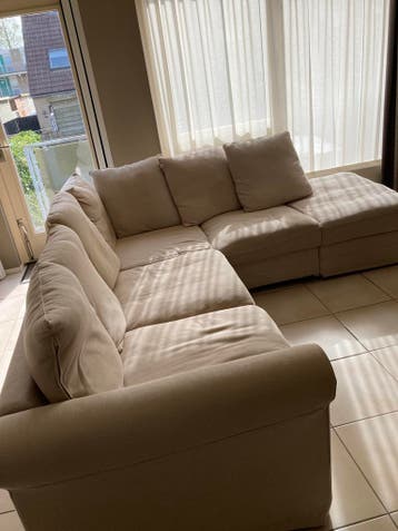 Hoekbank, crème kleurig, zou gereinigd moeten worden afmetingen lengtes 250 cm, 220 cm diepte 94 cm hoogte 67 cm, met kussen 90 cm