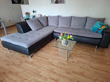 Deze hoekbank is 2.80 X 2.30 Meter. De bank heeft een zwart onderstel en grijze kussens. De zitkussens zijn gecapitonneerd. De bank staat op zilverkleurige poten. Moet weg ivm verhuizing.