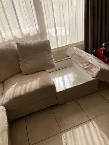 Hoekbank met 4 zittingen en opberg mogelijkheid voor kussens. Crème kleurig. Mogelijk in delen uit elkaar te halen. Moet wel gereinigd worden lengtes 250 cm, 240 cm diepte 93 cm hoogte zitting 40 cm h