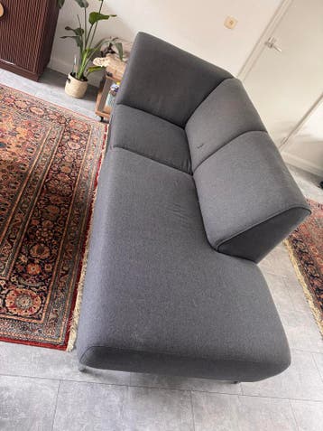 Dit is een deel van een hoekbank in een grijze stof. Het heeft een chaise longue gedeelte aan de rechterkant. Er zitten wat kleine beschadigingen op de stof, zoals te zien is op de foto's.