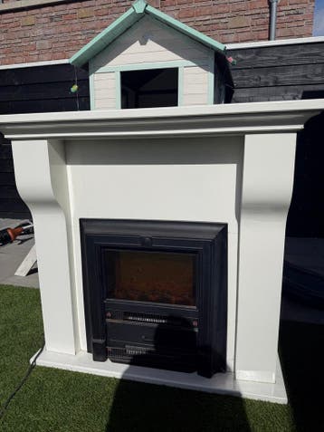 Witte schouw met een ingebouwde elektrische haard. De schouw heeft buiten in de overkapping gestaan. De haard is zwart van kleur.