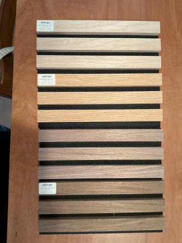 Set van proefstukjes van adeqo akoestische wandpanelen. De set bevat 3 samples van verschillende soorten eikenhout en 1 sample walnoothout. Bij verzending zijn verzendkosten voor 'koper'.
