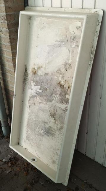 Ik geef een wasmachine lekbak weg, lang genoeg voor twee wasmachines. Het materiaal is plastic, met een bodem van multiplex. Geen