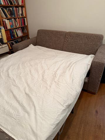 Wegens verhuizing slaapbank met aparte matras aangeboden matras is 1,90 bij 1,30 er past ook een matras van 2,00 bij 1,30 op. Breedte van de bank 1,85, diepte 0,94 en 0,90 hoog de kleur/ het dessin va