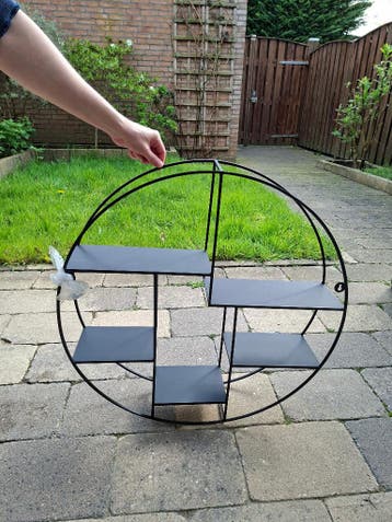 Vakkenkast/wandrek kleur: zwart. Er zitten wat gebruikssporen op maar als je er objecten in zet, zul je dit niet echt meer zien. Metaal. Met schroeven erbij (moet worden gemonteerd aan de wand). Diame