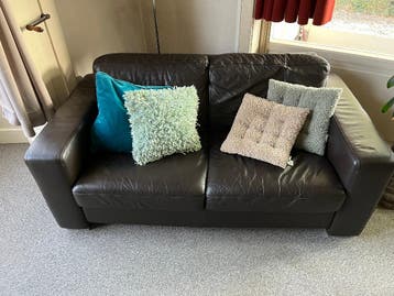 Donkerbruine lederen bank die nog lekker zit en er goed uitziet. Breedte: 165 cm diepte: 88cm de bank ziet er nog goed uit. Hij moet z.s.m. Weg i.v.m. Verhuizing.