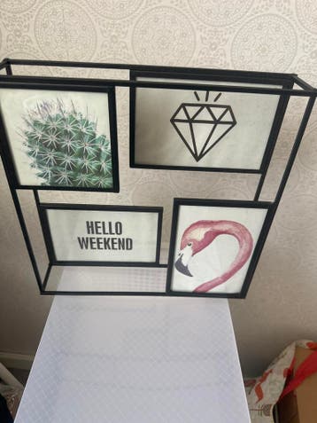 Een zwarte fotolijst met vier aparte vakken. Er zitten nu vier verschillende afbeeldingen in, zoals een cactus en een flamingo. De lijst is vierkant van vorm.