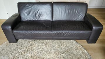 Een antraciet lederen bank met drie zitplaatsen. Lengte: 1,21 cm. De bank is in nette staat met kleine gebruikerssporen.