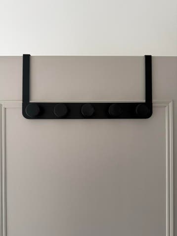 Handige zwarte kapstok die eenvoudig over een deur gehangen kan worden. Ideaal voor het ophangen van jassen, tassen of handdoeken. Voorzien van 5 stevige haken. Geen boren nodig. Gemaakt van metaal.