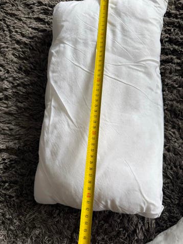 Het kussen is wit. Met een leuke nieuwe sloop weer zo goed als nieuw. Het kussen heeft een rechthoekige vorm, zoals te zien is op de foto's. De afmetingen zijn ongeveer 45 cm lang en 20 cm breed.