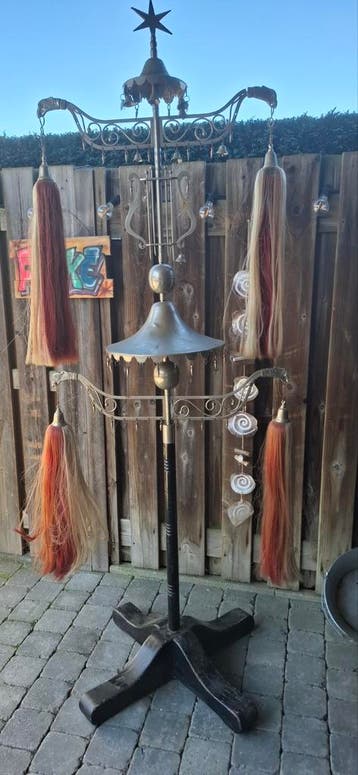 Dit is een schelleboom, ook wel sjellebaom genoemd. Het is een muziekinstrument dat bestaat uit een standaard met bellen en andere versieringen. Het instrument heeft een metalen frame en een houten vo