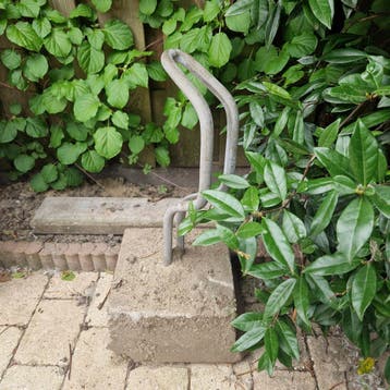 Stevige fietsstandaard, bevestigd op een betonnen blok.