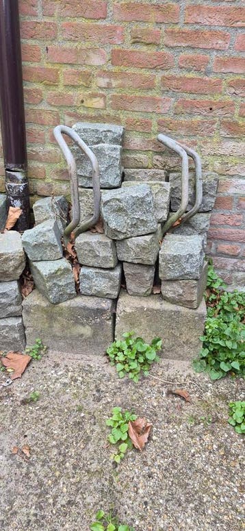 Twee stevige fietsenstandaarden, elk verzwaard met een robuuste steen om in te graven.