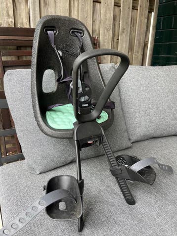 Dit is een thule yepp voorzitje. Het zitje is zwart met een mintgroen kussentje. Er zitten voetsteuntjes aan die verstelbaar zijn. Het zitje heeft ook een veiligheidsgordel.